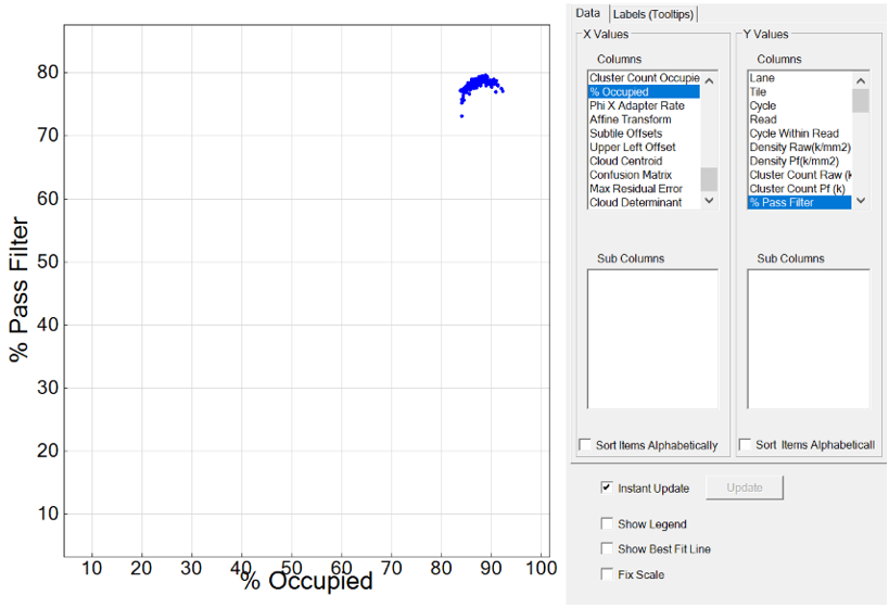 NovaSeq 6000和iSeq 100测序平台使用的是有一定数量纳米孔的patterned flowcell,文库在孔中进行簇生成。正是由于这一特点,当比较同一测序平台的测序结果时,不同批次测序之间的原始簇密度是相同的。为了优化NovaSeq 6000和iSeq 100测序平台的上样浓度,可以通过Sequencing Analysis View™ (SAV)软件绘制% Occupied和% Pass Filter的散点图来确定测序时上样浓度属于过低、最佳,还是过高。可以按照下面的说明绘制这些指标的散点图并根据散点图结果优化文库上样浓度。