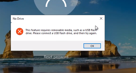 When trying to reset the admin password on a Windows sequencing system without entering the current password, users may get an error: “This feature requires removable media, such as USB flash drive. Please connect a USB flash drive, and then try again.”