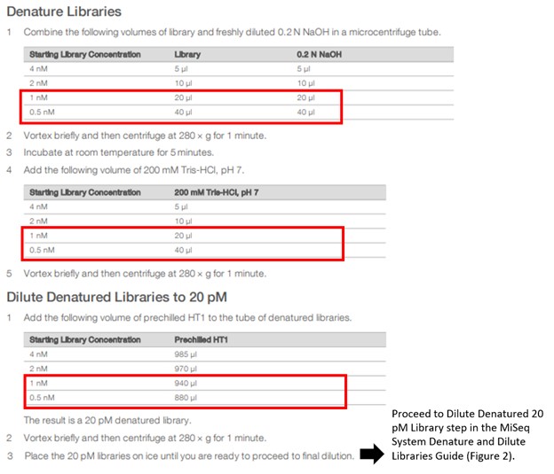图 2. MiSeq系统变性和稀释文库指南标准均一化方法中对变性后的20 pM文库进一步稀释的步骤