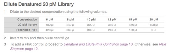 在文库浓度低于2 nM且高于0.5 nM的情况下也可以进行MiSeq的测序。可通过以下的标准均一化流程NextSeq 500和550测序系统的文库变性和稀释指南将文库稀释到20 pM。这个方案中,可添加200 mM Tris-HCl来中和过量的NaOH,以确保NaOH在最终的溶液中被完全中和。