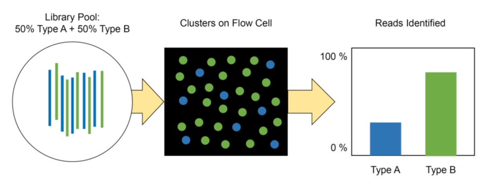 1. 无法预测的簇密度和对测序质量的负面影响。不同的文库类型可以有不同的片段长度,较短的文库相比较长的文库成簇效率更高。因此,相对于较长的文库,较短的文库将会过度表达(如图1),这有可能导致测序中簇密度过高。如果测序长度超过了较短文库的片段长度,测序质量就会受到负面影响。