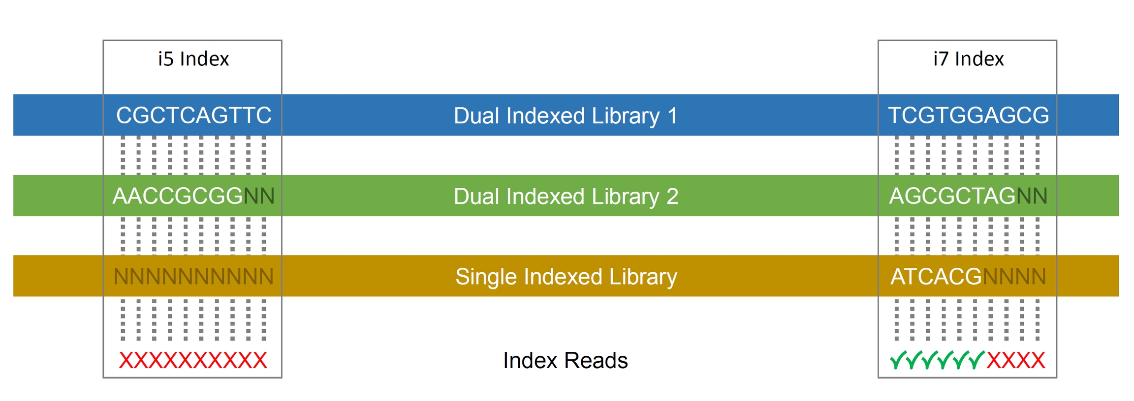 图3:红色的X表示文库混合物中未被读取的index的位置。绿色对勾√表示文库混合物中可以被读取的index的位置。在这个文库混合物中,仅单一的、6个碱基长度的index为可靠的读取结果,因为i7 index会被优先读取,这是为单index文库所作的index读取设置。这样的运行设置会对index拆分产生负面影响。