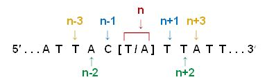 1)首先, 把SNP的位置定义为 “n” 。位置n的上游5'端和下游3’端各1个的碱基位置则为 “n-1” 和 “n+1” 。n上游5’端和下游3’端各2个的碱基位置则为 “n-2” 和 “n+2” 。以此类推。