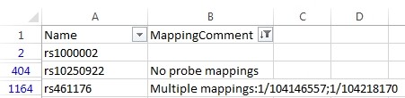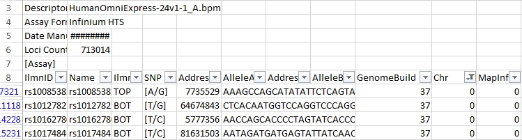 针对在manifest文件中Chr/MapInfo为0的位点,请参考Illumina.com官网产品支持文件中的比对备注(Mapping Comments)文件。这个文件的Mapping Comments列提供了为什么这些位点标注为0: