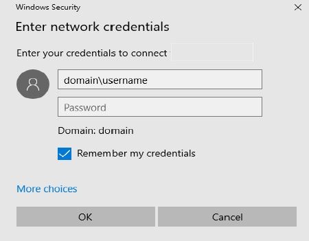 在Windows安全性提示中输入有权访问所用网络存储位置的用户的凭据。凭据应为“域\用户名”和网络存储位置的密码。