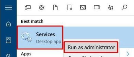在任务栏中搜索Services,然后右键单击并Run as administrator(以管理员身份运行)以打开应用程序。