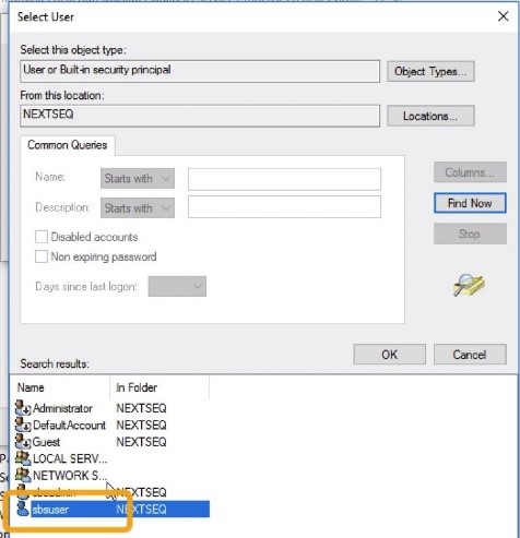 选择This account(此账号),然后点击Browse以搜索该账号。在Select User (选择用户)窗口中,选择Advanced(高级),然后选择Find Now(立即查找)。从搜索结果中选择本地用户凭据(默认为sbsuser)。