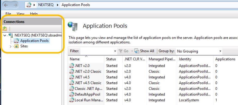 在左侧的Connections面板下,点击向右箭头以展开仪器图标,然后选择Application Pools(应用程序池)。